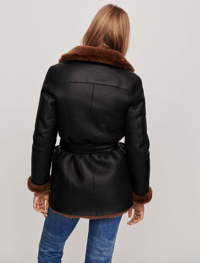 Peau lainée réversible façon canadienne. Elle se porte droite ou ceinturée à la taille, ouverte ou boutonnée.