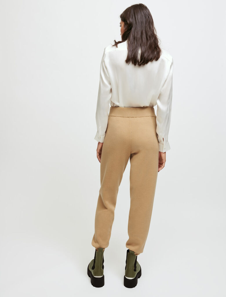 Pantalon droit en maille légèrement stetch resserré en bas par des bords côtes. Poches sur les côtés. Elastique à la ceinture.