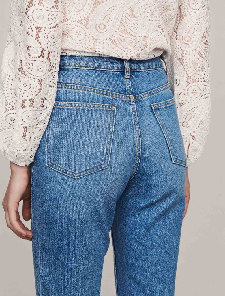 Jean mom à taille haute et jambe droite. Denim délavé en coton écoresponsable. Deux poches devant et petite poche ticket, deux poches dos. Bouton et zip braguette sur le devant.