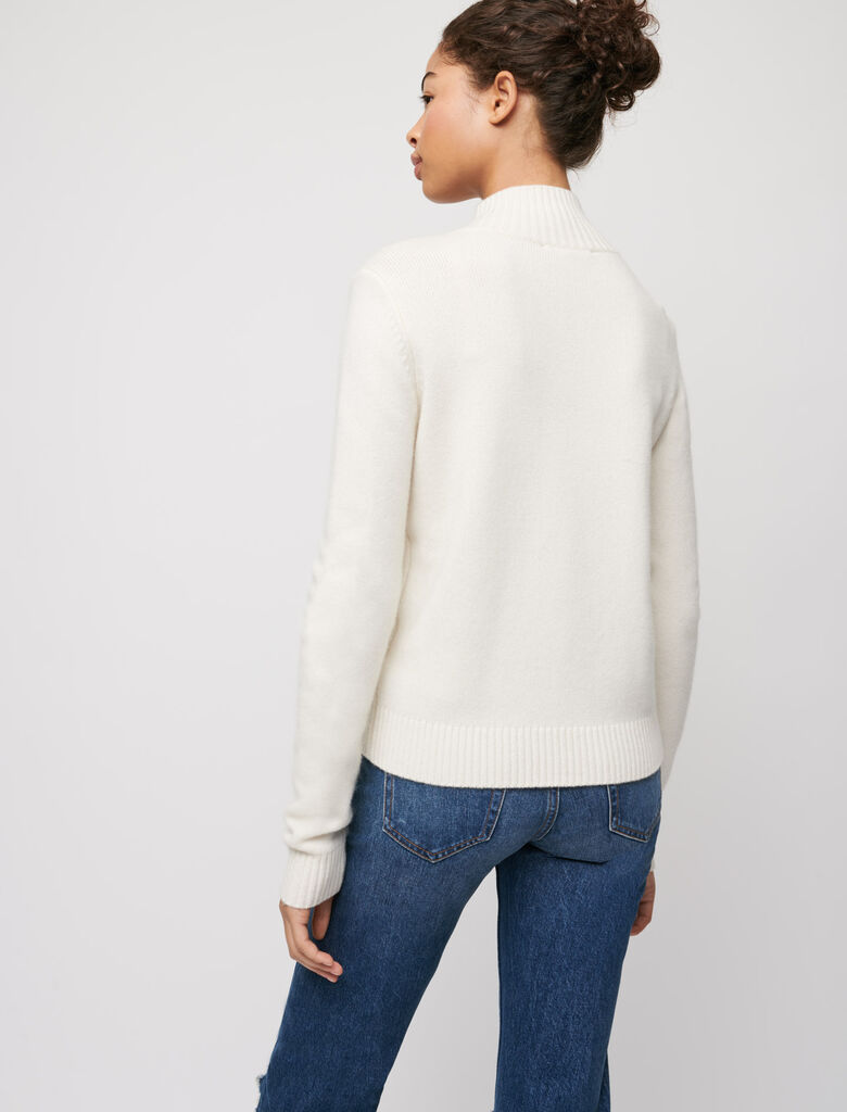 Pull à manches longues en cachemire stretch écru, à col montant fermé par cinq boutons-bijoux dorés cousus sur chaque épaule.