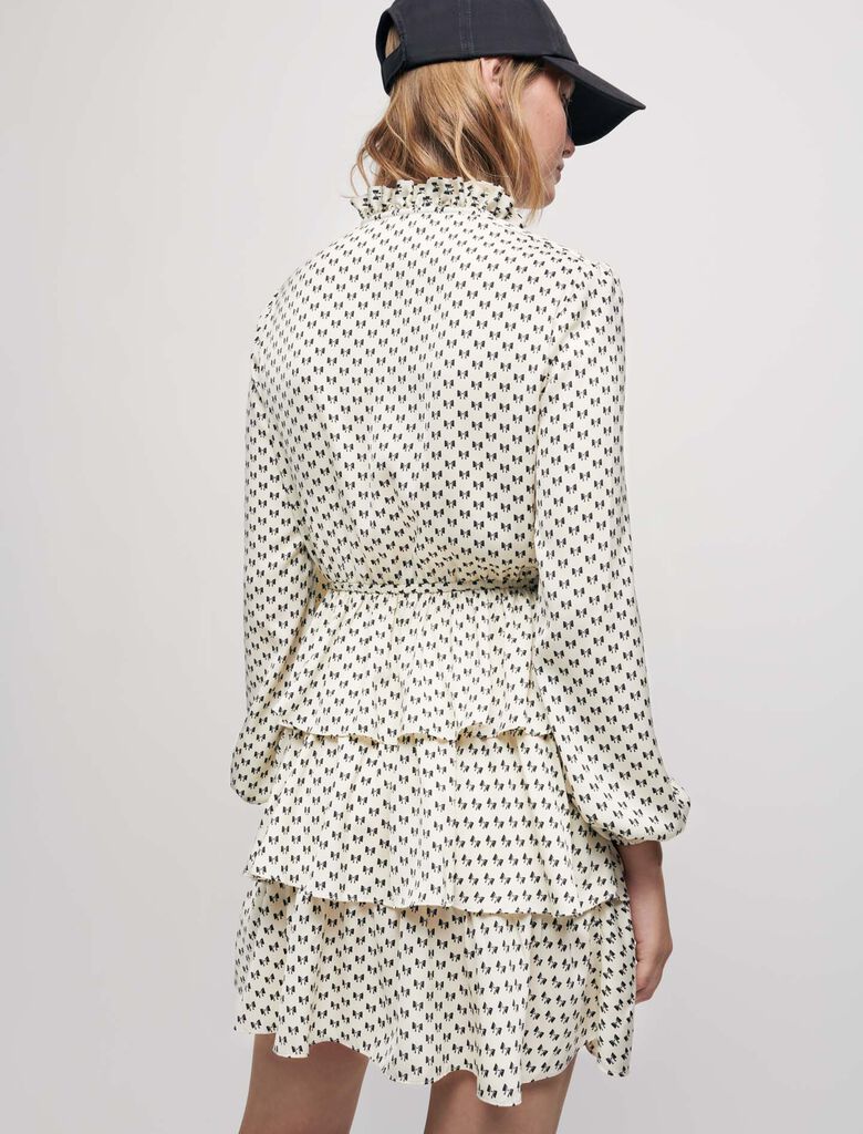 Robe courte et fluide cintrée à la taille en matière légèrement satinée à imprimé nœuds. Manches longues amples et fluides resserrées en bas par un élastique. Col plissé montant et décolleté qui peut se fermer avec des liens. Elastique à la taille. Volants sur la jupe.