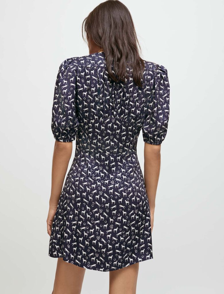 Robe courte façon portefeuille légèrement cintrée à la taille. Jacquard viscose satiné à imprimé petits chevaux Maje écru sur fond marine. Manches courtes et droites resserrées en bas par des élastiques. Décolleté V. Petits boutons sur le devant.